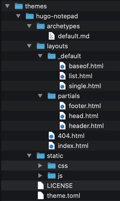 index.html是首页,single.html是文章页面。baseof.html所有页面的模版,每个页面都是基于这个页面进行扩展。css目录用来放样式文件。head.html用来定义<head>部分的内容,加载 CSS 样式文件就在这里添加。footer.html一般用来展示版权信息。header.html显示在顶部,展示网站名称。
