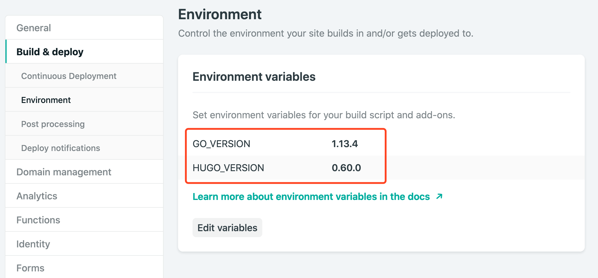 默认设置下 netlify 使用的是保守设置,不会使用最新版本的 go 和 hugo 来构建网站。