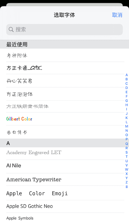 UIFontPickerViewController 是 iOS13 新增的一个选择字体的组件,可以选择已安装的自定义字体。