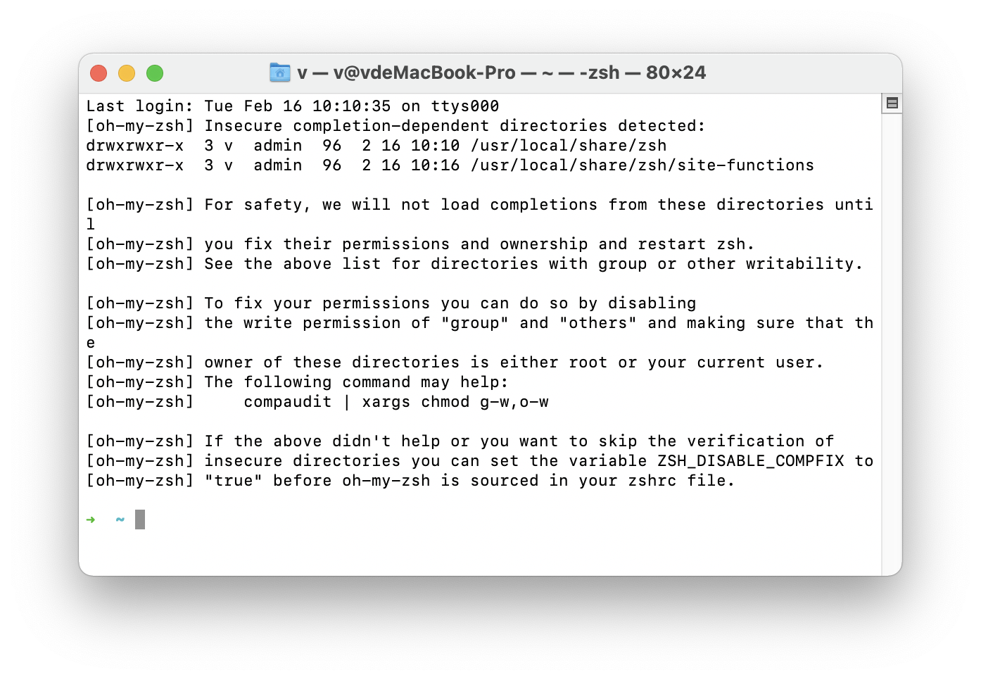 安装了 OhMyZSH 和 Homebrew,打开终端后就会提示目录的权限不安全: