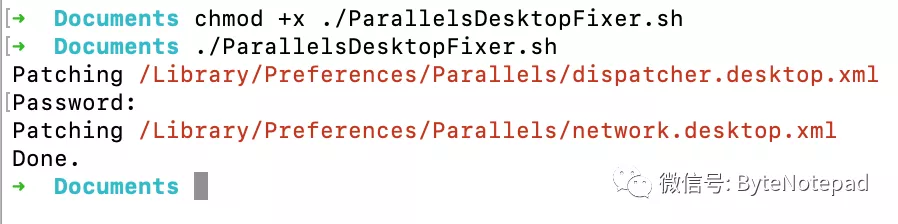 先完全退出 Parallels Desktop,然后把以上 Shell 脚本的内容保存为 ParallelsDesktopFixer.sh ,再 chmod +x 设置为可执行,在终端下运行: