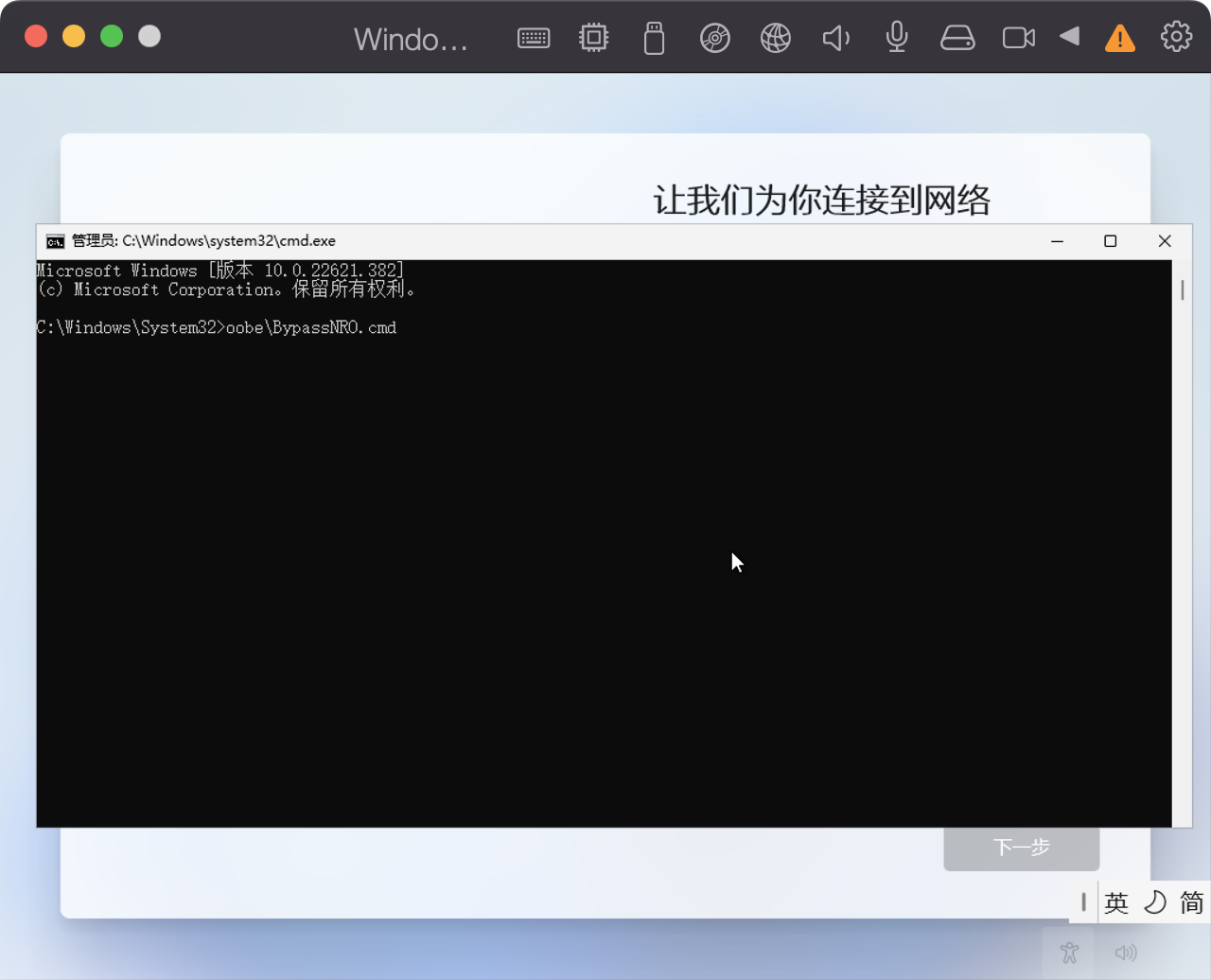 按下 Shift + F10,调出命令行界面,输入 oobe\BypassNRO.cmd,然后回车。系统会重启然后重新始安装流程,就不再强制要求连接 Internet 了:
