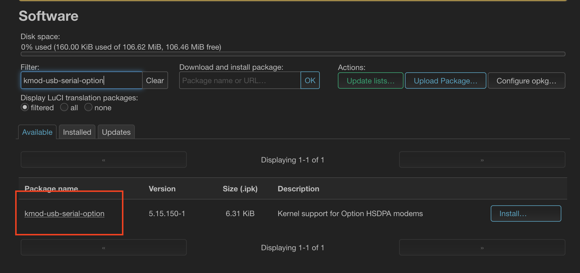解决方法是手动安装 kmod-usb-serial-option 组件: