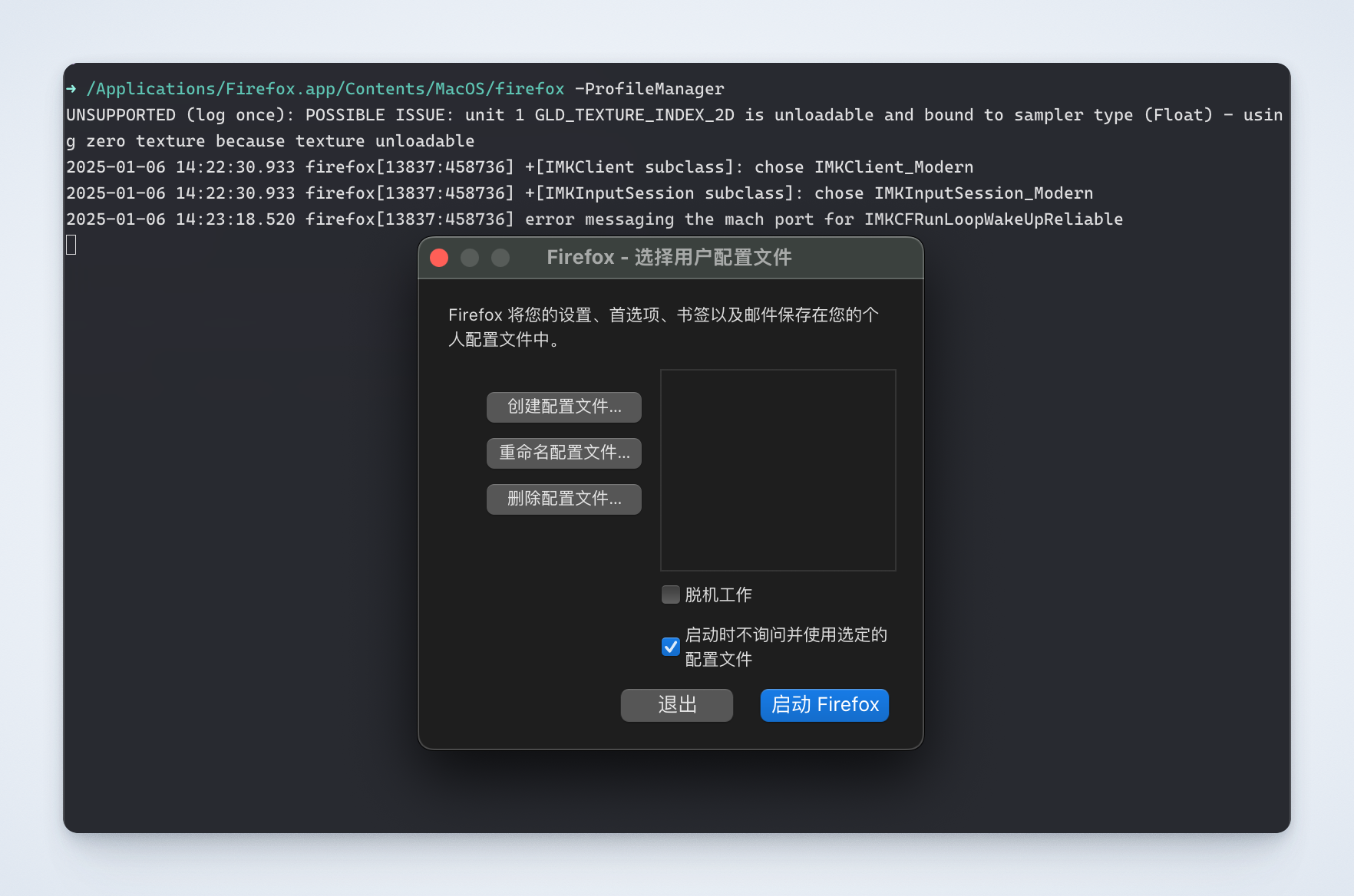 $ /Applications/Firefox.app/Contents/MacOS/firefox -ProfileManager