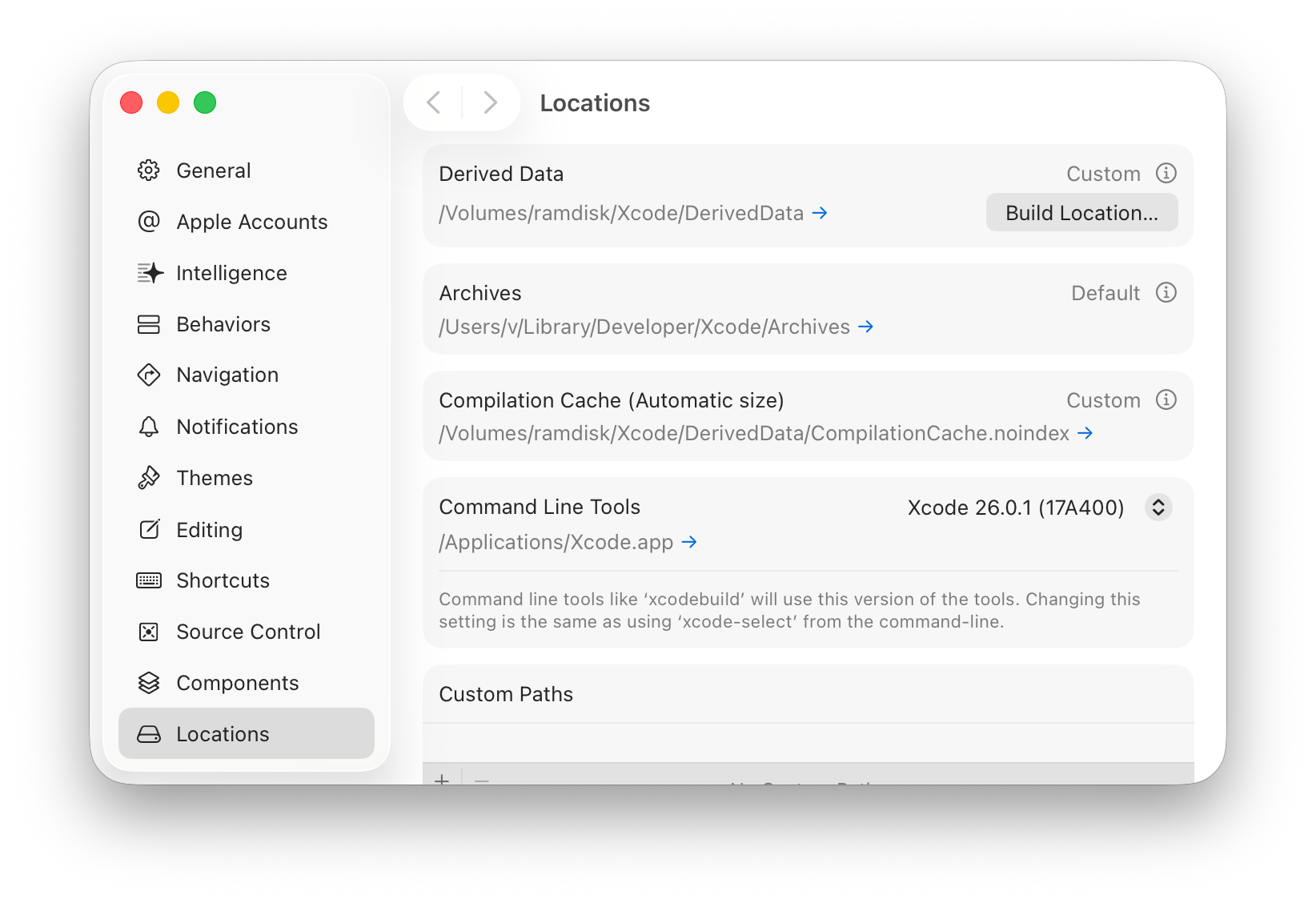 <?xml version="1.0" encoding="UTF-8"?> <!DOCTYPE plist PUBLIC "-//Apple//DTD PLIST 1.0//EN" "http://www.apple.com/DTDs/PropertyList-1.0.dtd"> <plist version="1.0"> <dict> <key>Label</key> <string>me.lvv.mkramdisk</string> <key>EnvironmentVariables</key> <dict> <key>PATH</key> <string>/sbin:/usr/sbin:/bin:/usr/bin</string> </dict> <key>ProgramArguments</key> <array> <string>/bin/bash</string> <string>-i</string> <string>/opt/local/share/libexec/mkramdisk.sh</string> </array> <key>RunAtLoad</key> <true/> </dict> </plist>/Library/LaunchDaemons/me.lvv.mkramdisk.plist,然后加载这个服务:$ sudo launchctl load -w /Library/LaunchDaemons/me.lvv.mkramdisk.plist - 配置 Xcode 的 DerivedData 目录为虚拟磁盘:
